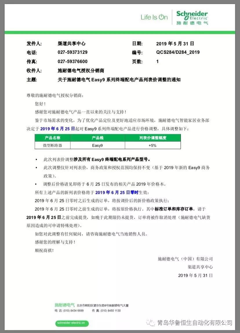 感謝新老客戶對(duì)施耐德產(chǎn)品和我公司的信任與支持,鑒于市場(chǎng)需求的變化,施耐德于2019年6月25日起對(duì)Easy9系列終端配電產(chǎn)品進(jìn)行價(jià)格調(diào)整,漲價(jià)幅度5%,客戶朋友們悉請(qǐng)知曉!